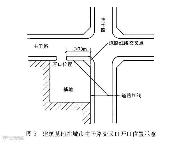 -1 中等城市、大城市的主干路交叉口,自道路红线交叉点起沿线70.0m范围内不应设置机动车出入口;