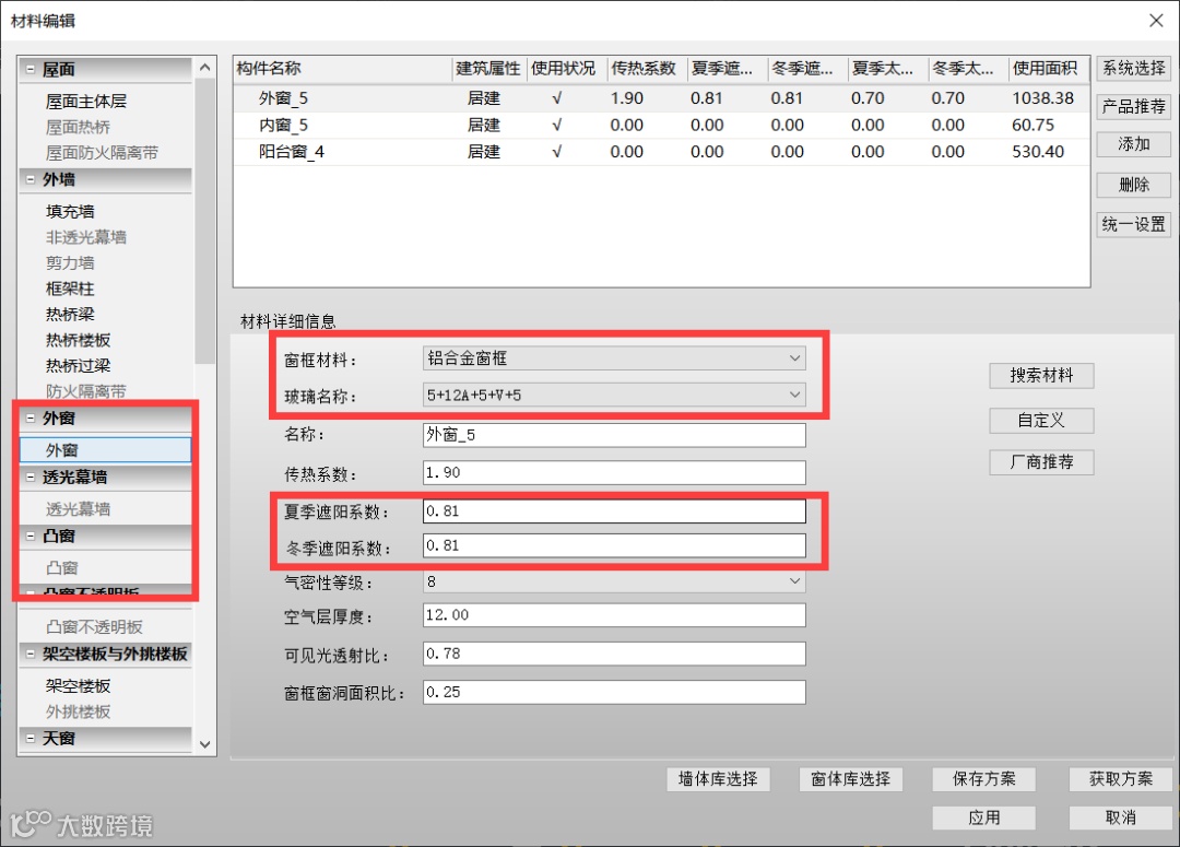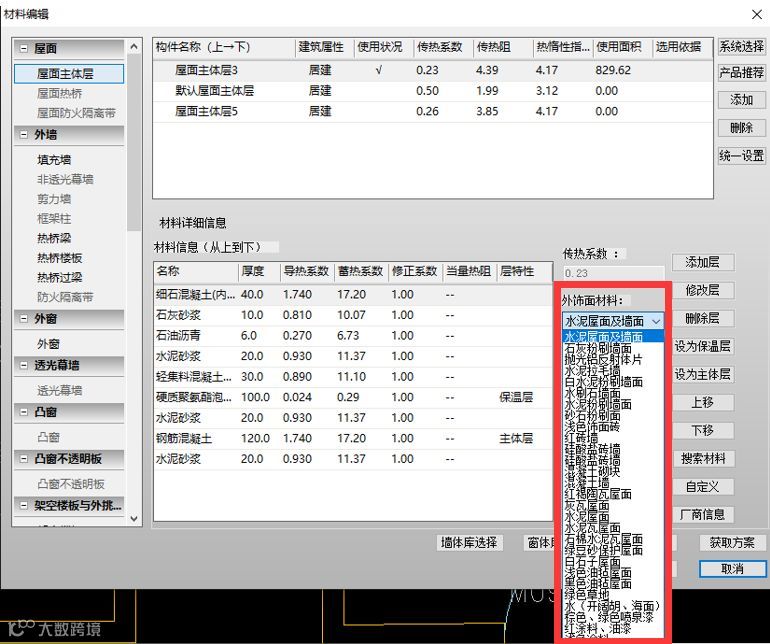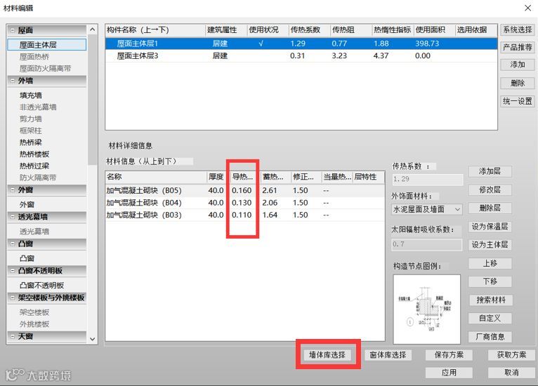 墙体的能耗占围护结构能耗较大比例,在当地或者最新的全国材料数据库中选择材料,同种材料保温性能一般更好。