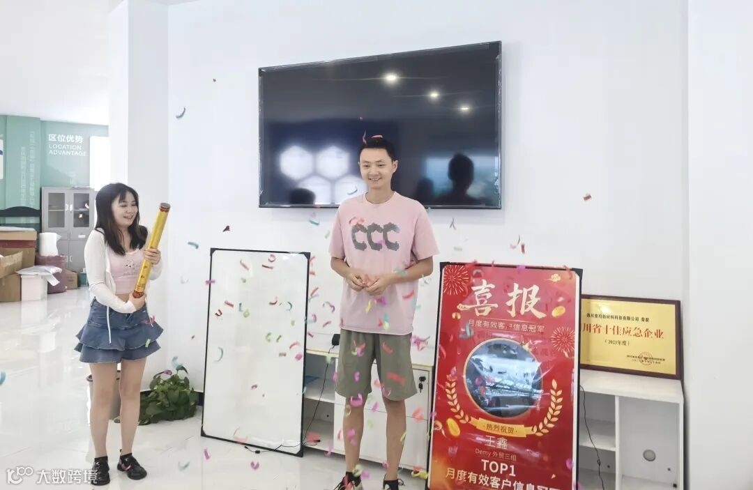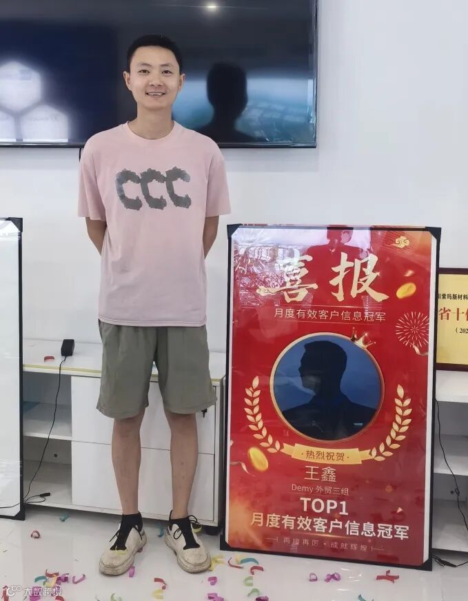 活动结束后,参加活动的全体人员顺势为外贸三组组员Demy(王鑫)举行了简单的颁奖仪式,表彰他在6月份的工作中获得“月度获取有效客户信息排行榜”冠军。