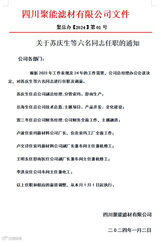 表彰大会最后,根据2023年工作表现及24年的工作需要,卢总向全体员工宣布了《关于苏庆生等六名同志任职的通知》文件,对公司相关人事做了部署调整。
