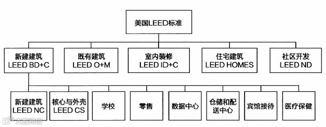 美国LEED标准分为5大类,分别为:新建建筑设计及施工(LEED BD+C)、既有建筑运营及维护(LEED O+M)、室内装修设计及施工(LEED ID+C)、住宅建筑(LEED HOMES)、社区开发(LEED ND)。其中LEED BD+C又可细分出新建建筑(LEED NC)、核心与外壳(LEED CS)、学校、零售、数据中心等等。
