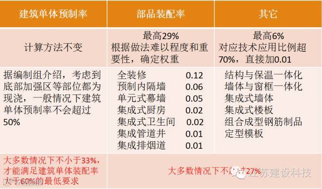 1.装配率计算只针对单独构件或建筑部品,未提出单栋建筑的装配率计算方法(分6类,各部位装配率均大于50%,视同建筑整体装配率大于50%)