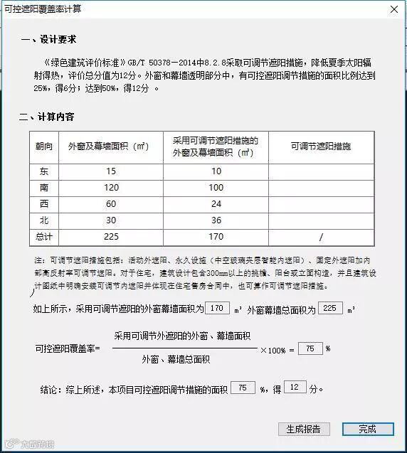 选择建筑专业—可控遮阳覆盖率,简捷的界面一目了然,通过填写不同朝向的外窗面积、可控遮阳措施的面积及可调节措施,软件实时计算出可控遮阳覆盖率,并实时展示得分情况。点击生成报告即可输出格式规范、过程详尽、结果清晰的报告书。