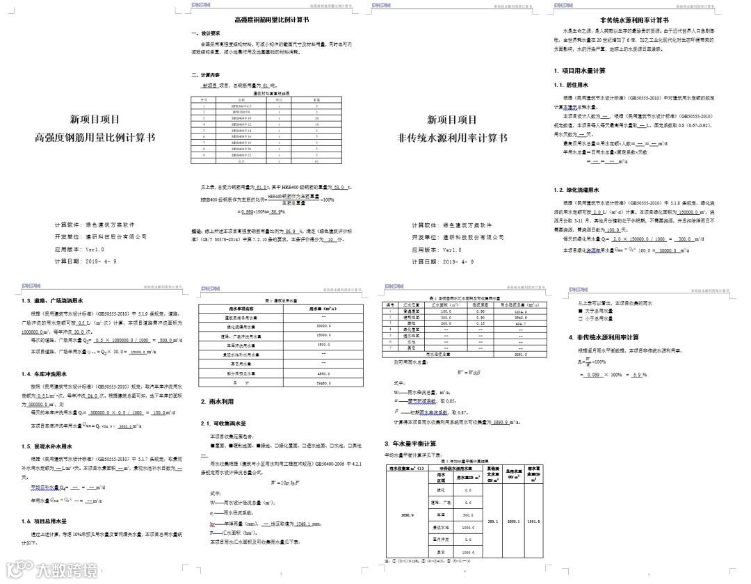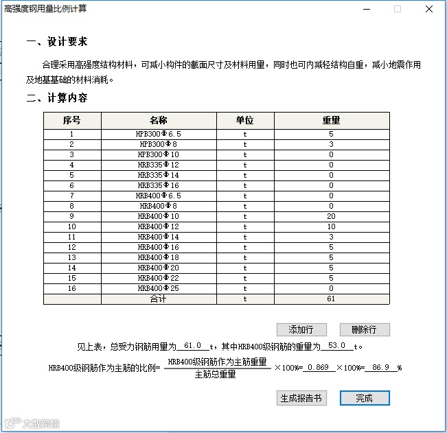 选择结构专业—高强建筑结构材料用量比例,通过填写不同强度的材料用量,软件实时计算出高强建筑材料用量比例,并实时展示得分情况。点击生成报告即可输出格式规范、过程详尽、结果清晰的报告书。