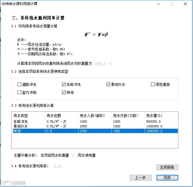 选择给排水专业—非传统水源利用率,软件会指引设计师对项目用水量、非传统水源收集量等指标进行填写,软件自动非传统水源利用率,并实时展示得分情况。点击生成报告即可输出格式规范、过程详尽、结果清晰的报告书。