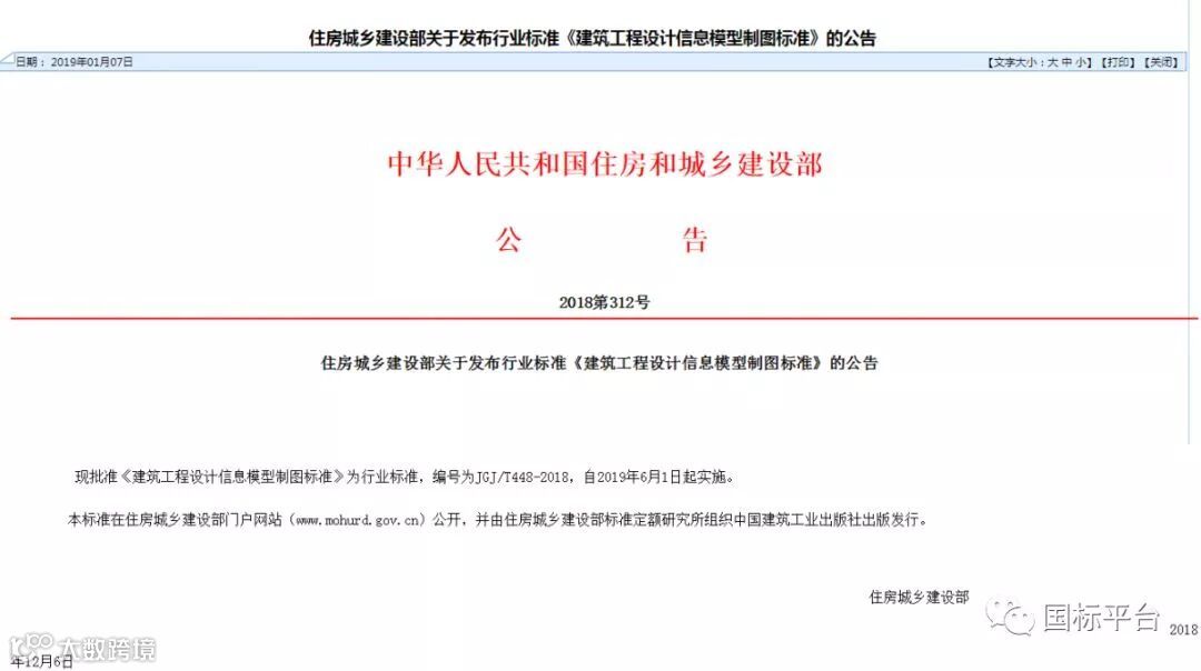 2019年1月7日,国家工程建设标准化信息网发布了“住房城乡建设部关于发布行业标准《建筑工程设计信息模型制图标准》的公告”,批准《建筑工程设计信息模型制图标准》为行业标准,编号为JGJ/T448-2018,自2019年6月1日起实施。