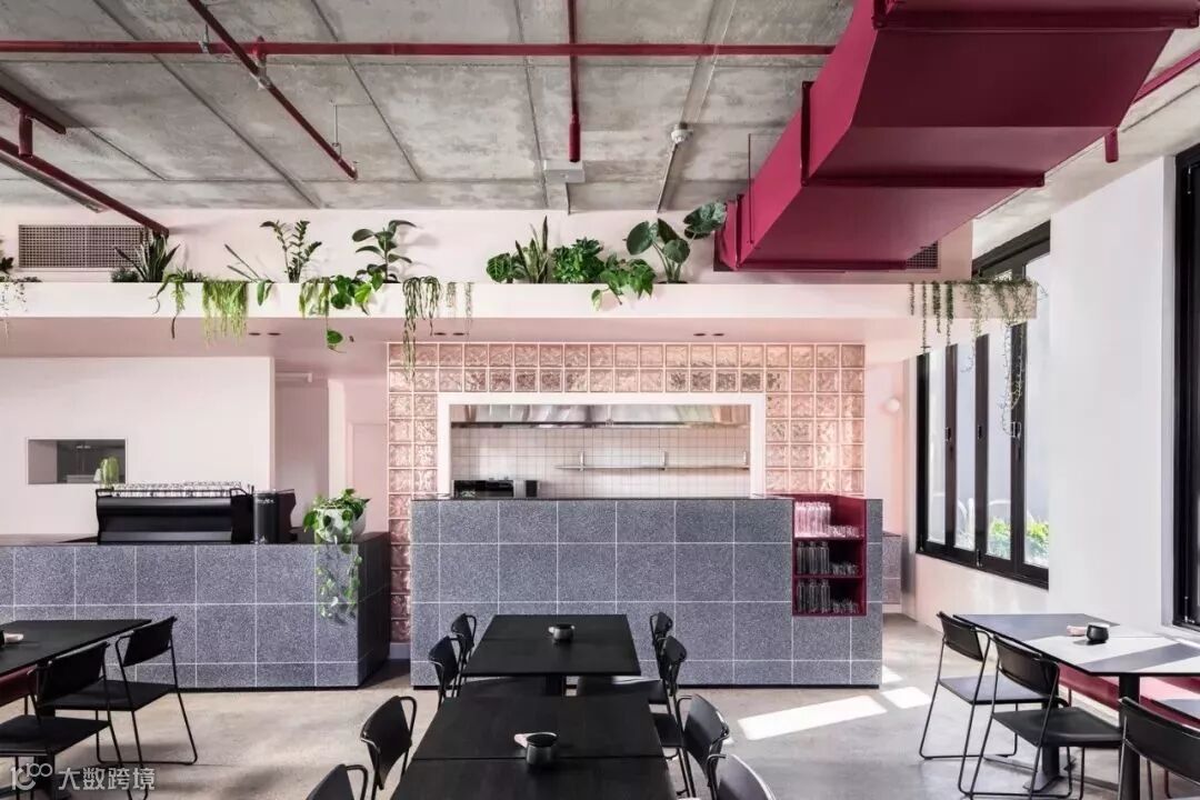 粉红色的玻璃砖搭建起厨房区域和部分会客区,让这个咖啡馆充满少女心 ▼