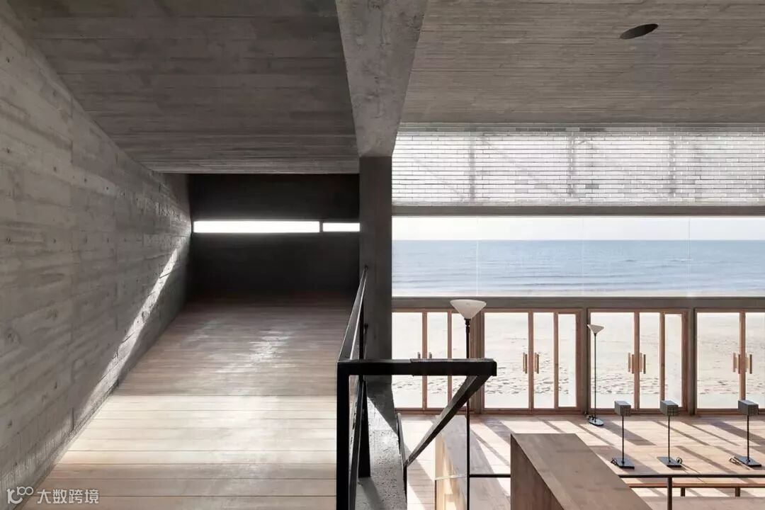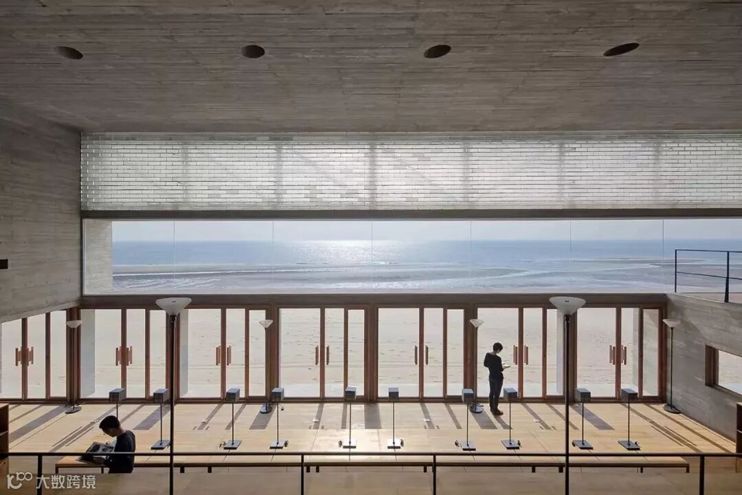 这座图书馆位于海边,像一块纯净而坚硬的风化岩石。在外墙的上方区块,采用的是透明的玻璃砖作为材料 ▼