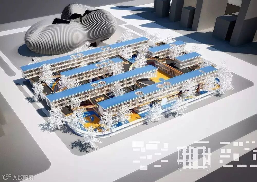 河南郑州新港小学的设计方案就是利用一连串的圆圈体量阵列组合,或镂空或实体,创造不仅属于孩子,更属于城市的“时尚圈”,在城市角度远观的时候也成为一种风景。