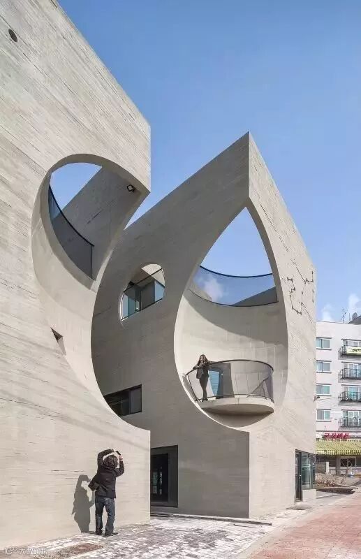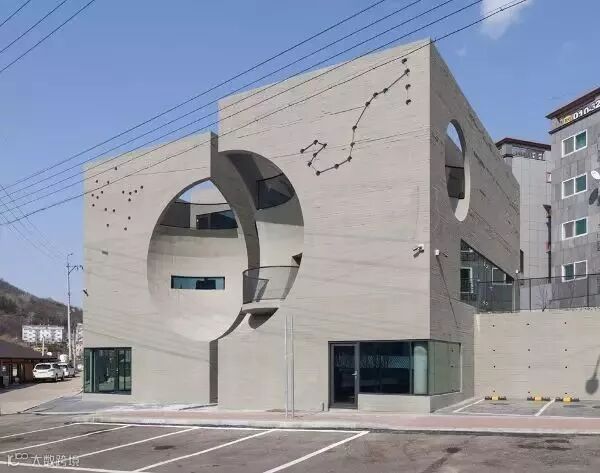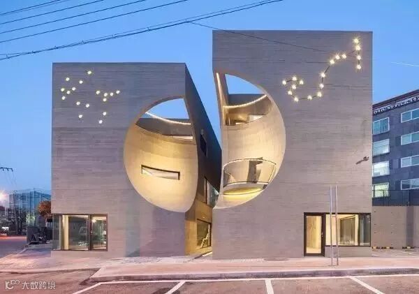 这栋一眼看上去就与众不同的时尚建筑,位于韩国高阳市京畿道的私人文化中心建筑,它的时尚外衣便是主立面这两个半月形的体量,并分别做洞口和窗户处理,最终形成一个完整“圆圈儿”。业主的灵感来自一部名为Two Moon Junction的电影,所表达出来的空间感要激情奔放,像那部电影一样,使这里成为一处充满欢乐和轻松气氛的所在。