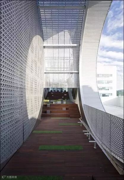 混凝土体量在“圆圈儿”外表下的交错穿插,形成了丰富的空间层次,圆形体量被细密的木条所覆盖,冲淡了与之相连的巨大大厅空间所带来的令人无助的空旷之感,又给这看似单一的圆圈增加了一层时尚外衣。充满了变化而又不可预测的内部空间以及巨大混凝土盒子中的阴凉空间对于那些富有善于探索和发现美的人来说极富吸引力。