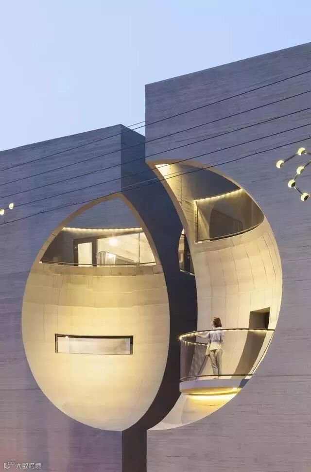 两个相对独立的混凝土盒子仿佛被一个球各自撞进去一个角部,空间的趣味一下子便有了。尤其是其中一个凹角后伸出了一个反弧的阳台,这里也许正是业主需要的诱人空间吧,站在此处抬头可望星空,近处又仿佛置身于月亮之中,相依相望,沉醉其中。而就在这时,对面混凝土盒子里,正有另外一个人躲在窗户后面偷偷观察你,这将是多么幸福的一件事件啊。