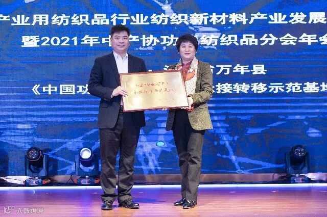 中国产业用纺织品行业协会会长李桂梅为万年县授《中国功能纺织品产业承接转移示范基地》牌匾。