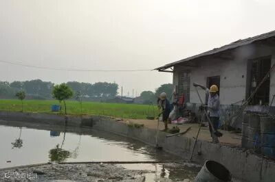 菁华铺乡政府组织人员在被污染的鱼塘中打捞油污。