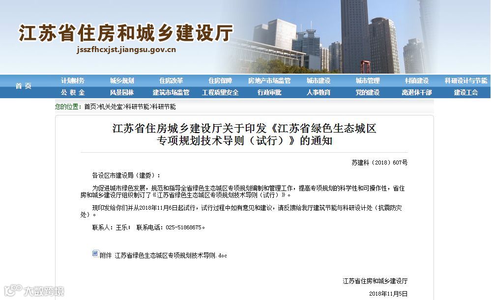 为促进城市绿色发展,规范和指导全省绿色生态城区专项规划编制和管理工作,提高专项规划的科学性和可操作性,江苏省住房和城乡建设厅组织制订了《江苏省绿色生态城区专项规划技术导则(试行)》。