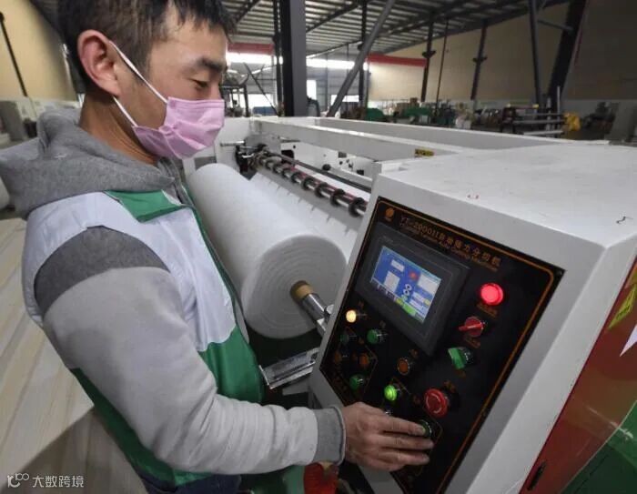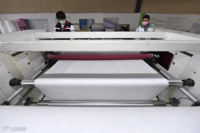 2月12日,四川索玛新材料科技有限公司技术人员在生产车间通过机械将熔喷布切割为口罩厂所需大小。