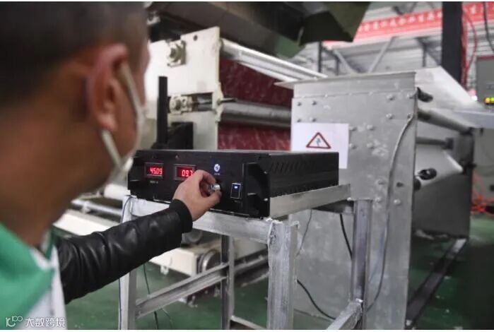 2月12日,四川索玛新材料科技有限公司技术人员在生产车间对熔喷布进行驻极处理。