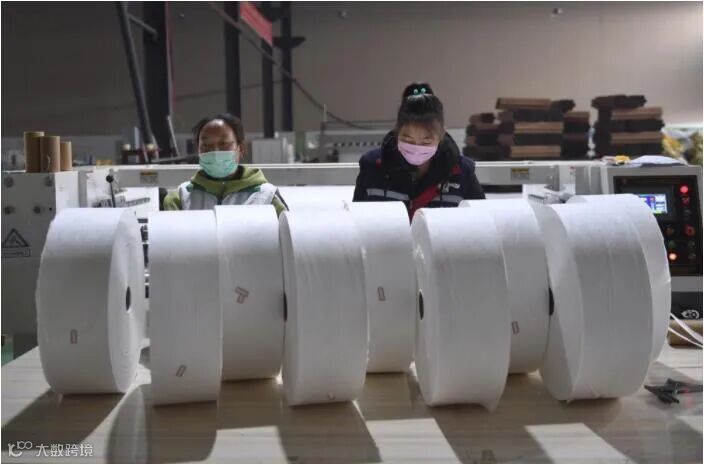 2月12日,四川索玛新材料科技有限公司技术人员在整理已经为口罩厂切割好的熔喷布。