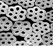 从上表可知目前在服装领域使用量最大的聚酯纤维(涤纶)也很适合用于制备保暖絮片。不过光光从导热系数上看,聚丙烯和聚酯都超过了羊毛,但为什么我们却感觉羊毛衫、羽绒服更保暖呢?原因在于多孔结构,下图为北极熊毛发的剖面图。此时起保暖作用的为存在孔中的空气(静止滞留空气层)!仿生的角度出发,我们现在做的保暖用涤纶絮片都是卷曲蓬松、异形、多孔或者说桔瓣型的,下图为七孔涤纶纤维横截面图。由此可知,一件保暖性能优异的衣服,其表面必然有一致密层(可为涂层),同时其必然是轻便的。不过相应的问题在于多孔结构纤维的机械性能差,不耐洗涤。
