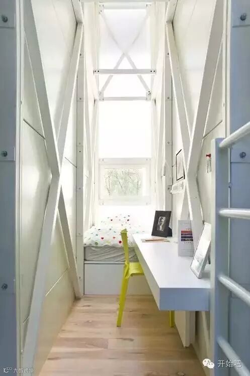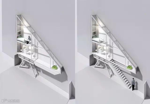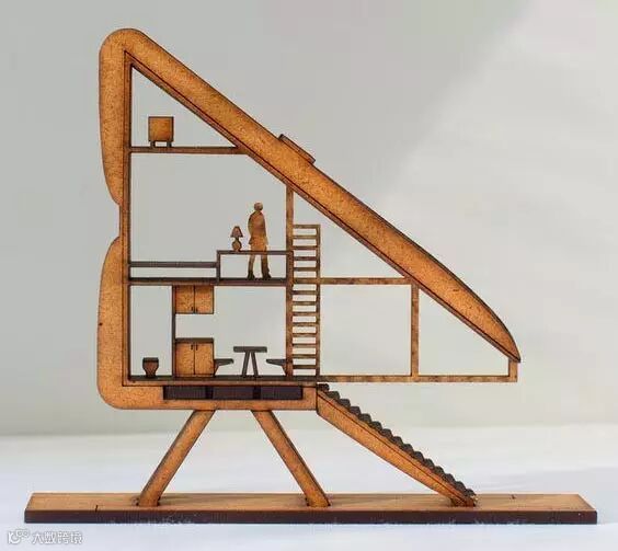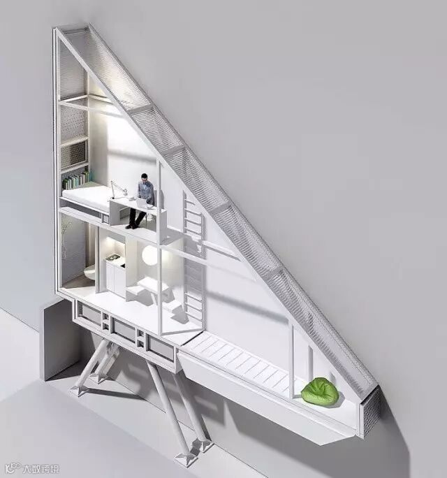 效果图出来,看起来还真像那么回事儿,房子是个直角三角形状的小复式。楼下是卫生间、厨房和客厅,楼上是卧室和工作室。