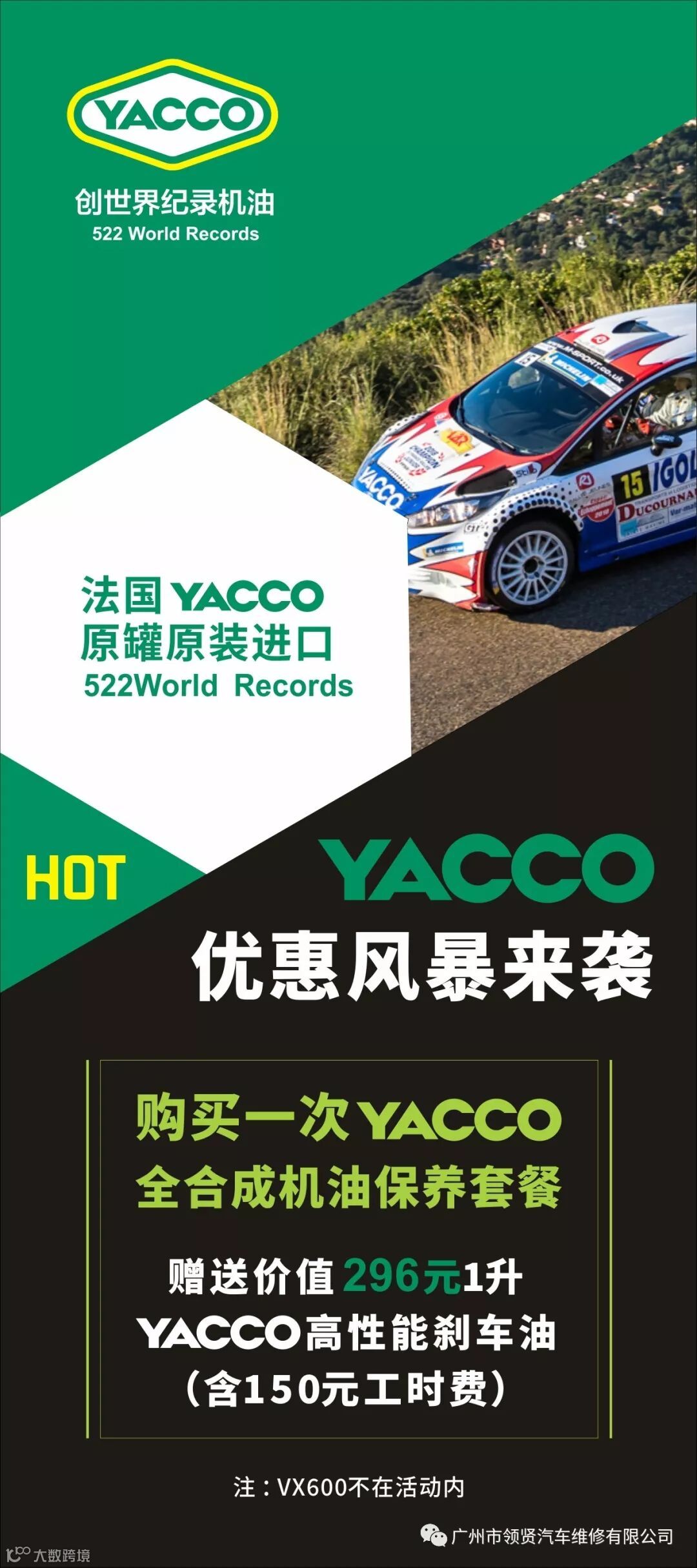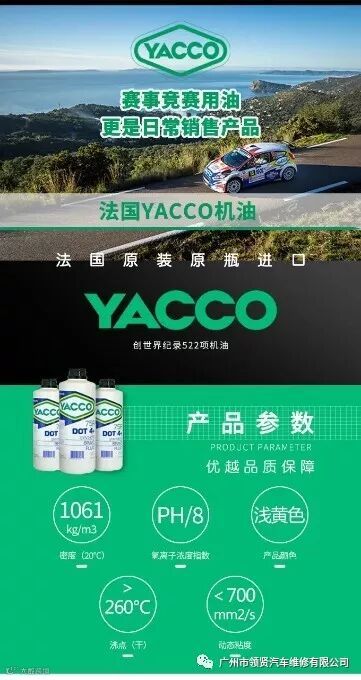 现凡购买YACCO全合成机油保养套餐一次,即送价值296元YACCO高性能刹车油1L(含150元工时费)