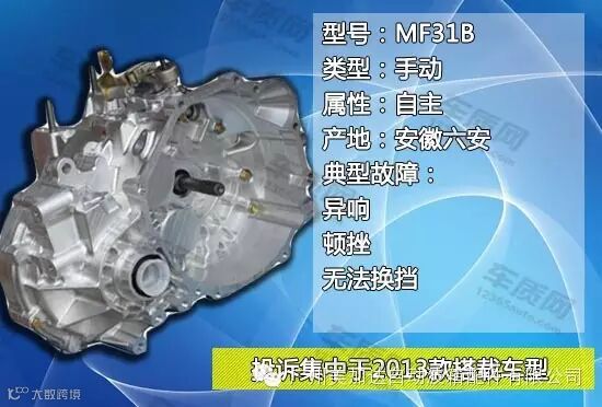 MF31B型号变速箱为安徽星瑞齿轮传动有限公司(原六安江淮汽车齿轮制造有限公司)生产,从消费者实际反馈的情况看,变速箱异响、啸叫、换挡顿挫、不好挂挡等一系列问题遭到消费者投诉。据消费者反映,MF31B型号变速箱1、2挡啸叫噪音大,1-4挡减速松油门时有明显顿挫感并伴随齿轮撞击声。有专业人士分析,MF31B型号变速箱异响、顿挫的根本原因可能是变速箱的速比不对,变速箱不能配合发动机的动力输出,过大的一二挡齿是造成顿挫的根本原因。这也是不少消费者尽管不断变换变速箱油品牌但始终不能改善异响、顿挫的症结。