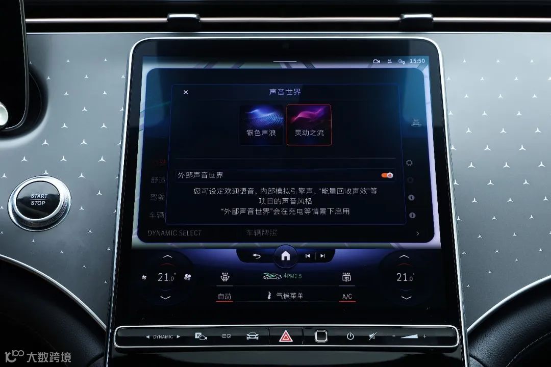 配合着Burmester®环绕立体声音响系统,“银色声浪”和“灵动之流”两种个性化模拟声浪可以声随形动,随着加速的变化呈现不同的声浪效果,进一步强化美妙的驾驶氛围。于声色的浪漫之中,全新EQE在绰约的西湖之畔,尽情释放在星辉斑斓里放歌的浪漫。