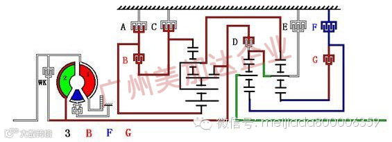 解体变速器前我们还是再次围绕3-2档冲击的故障形成原因展开分析,从油路及换档元件作业分配表中分析,3档的参与元件有:B(K1)+F(B2)+G(K3),两个离合器加上一个制动器完成3档的动力传递,而2档的参与元件有:A(B1)+F(B2)+G(K3),两个制动器加上一个离合器完成了2档的动力传递过程。因此3-2档时就是B(K1)与A(B1)的切换,即B(K1)离合器是一个释放过程而A(B1)制动器则是一次降档过程的接合过程(注:变速器在执行降档控制时发动机扭矩是一次上升调整过程),因此也正如技术公告所提到的极有可能是A(B1)本身出现了问题(当然A还在6档参与,但是出现在升档过程中的减扭矩过程因此可能体会不到冲击的感觉)。
