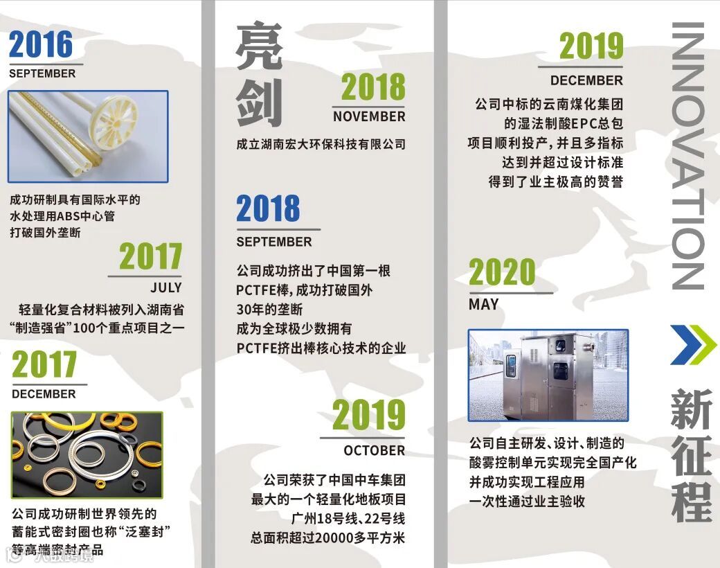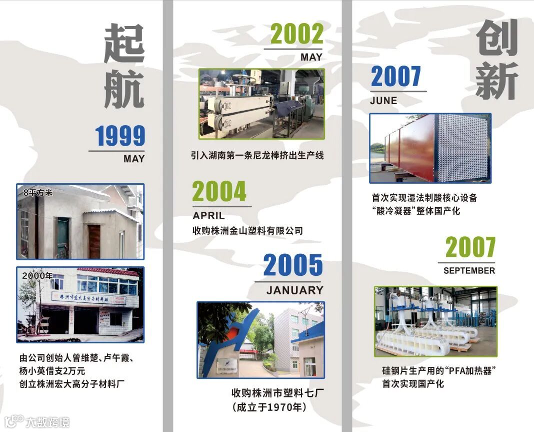 2005年公司通过收购原轻工部聚四氟乙烯定点企业——株洲市塑料七厂,继承了塑料七厂35年历史的技术积累,研制成功3项填补国内空白的创新技术:聚三氟氯乙烯挤出成型技术、聚偏氟乙烯大尺寸板材成型技术以及湿法脱硫制酸技术,研制成功2项替代进口的产品:弹簧蓄能密封圈、新型阻燃轻质复合板材,成为了国内可熔融氟塑料的领军企业。