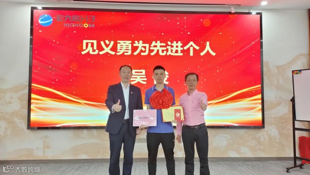 2025年4月10日,因株洲宏大高分子员工吴俊同志在危急关头挺身而出,以实际行动展现了见义勇为的高尚品格,弘扬了社会正气,充分彰显了宏大人的责任与担当。公司党支部书记、董事长曾维楚同志,工会主席吴湘发先生为吴俊同志,颁发"见义勇为先进个人"荣誉称号、奖金及积分奖励。
