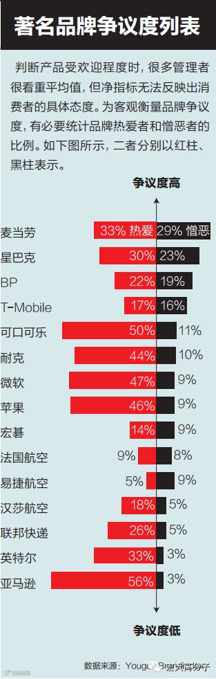 从下图的著名品牌争议度列表中,我们可以看到喜欢和憎恶麦当劳的人都在30%左右,说明麦当劳是高争议度的品牌。与之相比,亚马逊争议性很小。如果品牌经理根据平均值判断产品受欢迎程度,很可能无法了解真实情况,得出不客观的结论,而采取这种方式,则更明确地了解到对品牌爱憎人数的具体分布。