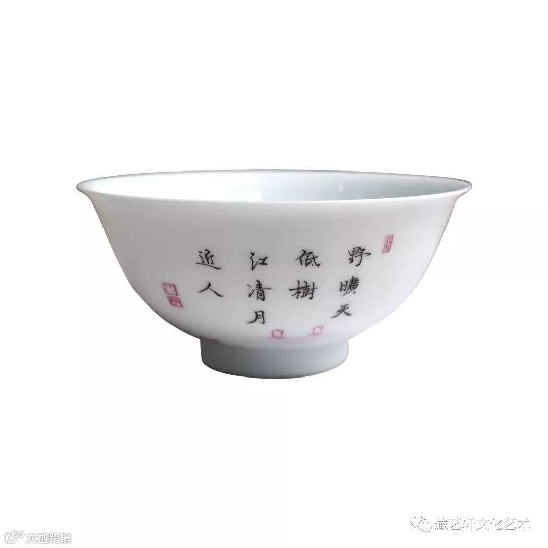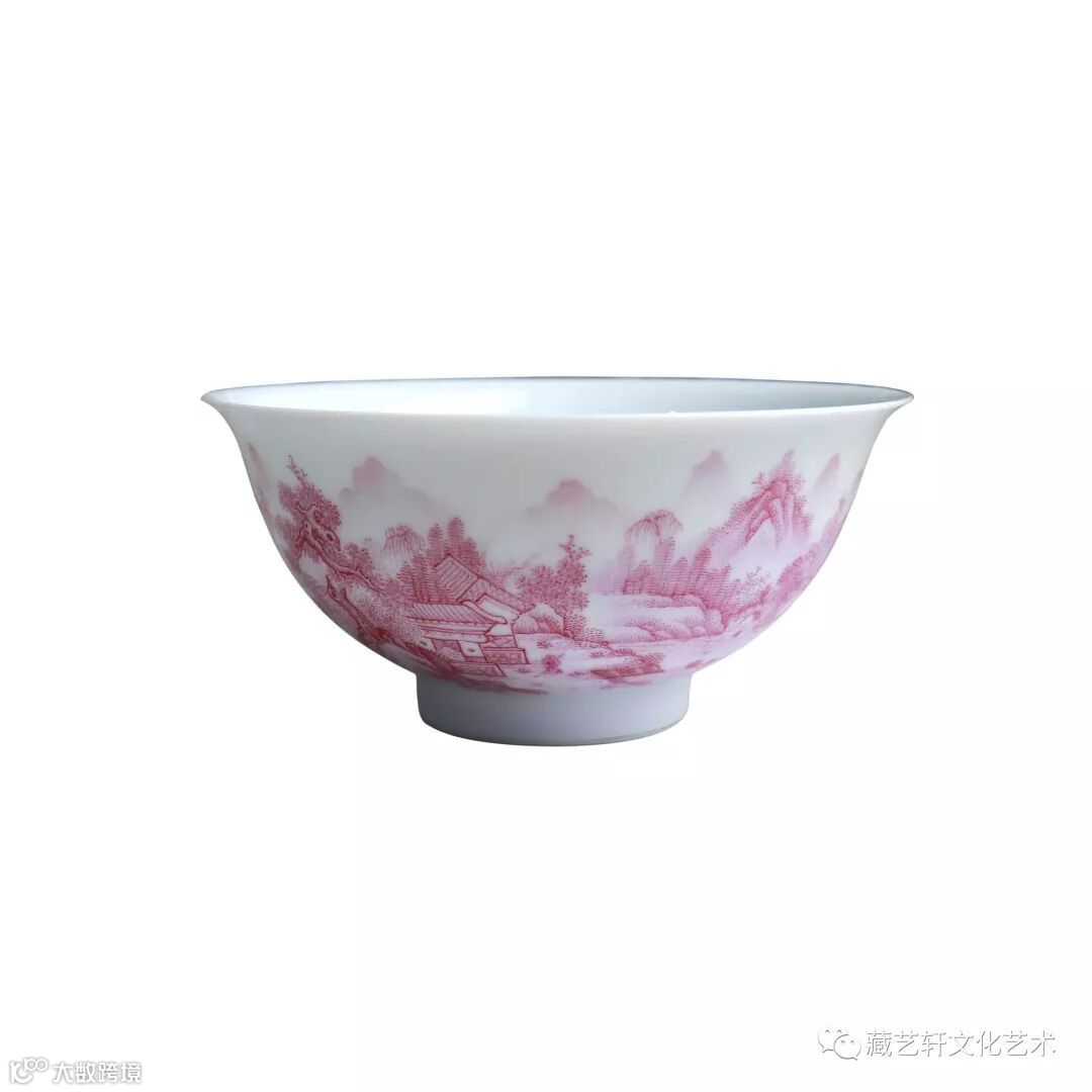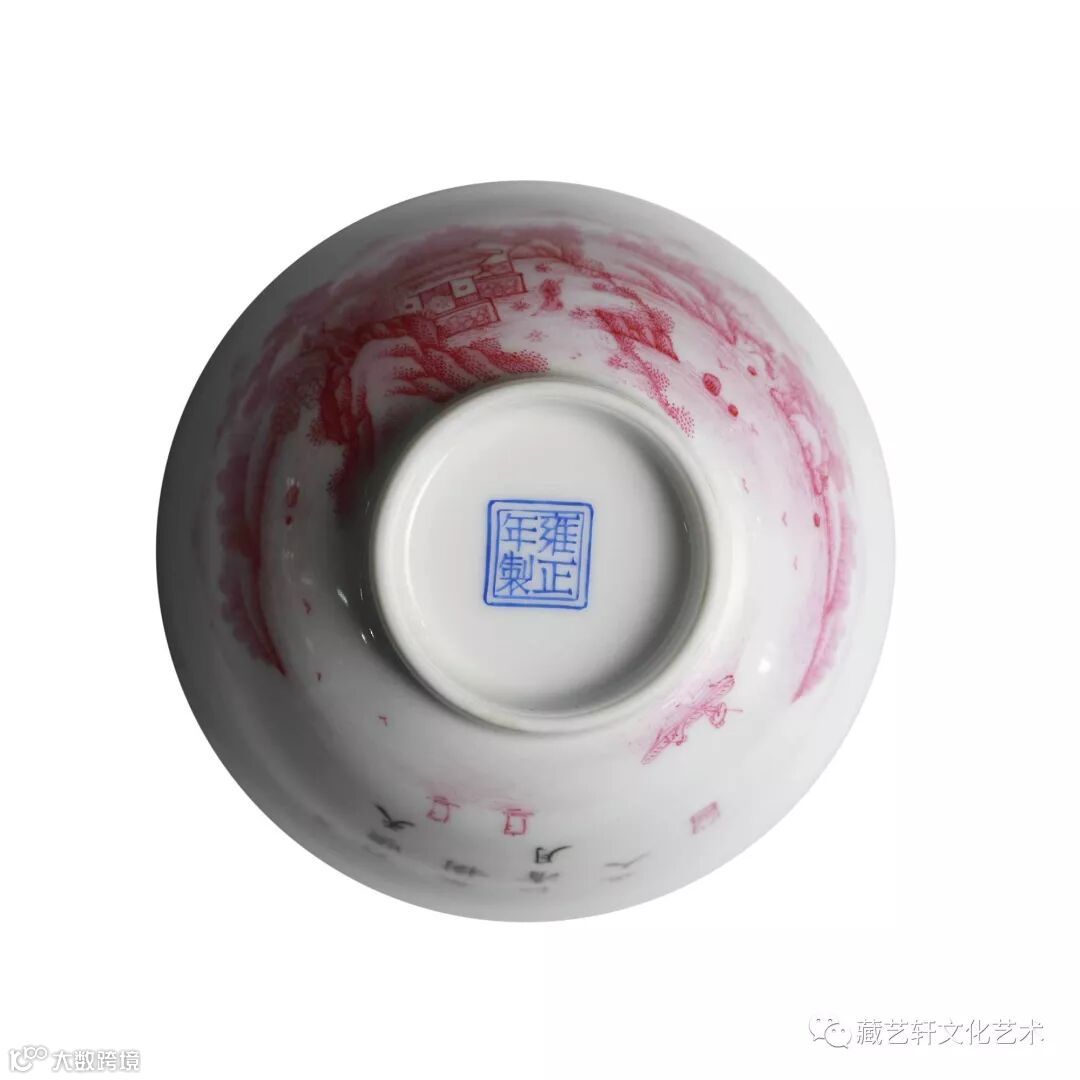 此碗敞口,弧腹,圈足。碗内施白釉,洁净均匀,润泽细腻。碗外胭脂红绘山水纹,山水乡居,画工精细。并题以诗句“野旷天低树,江清月近人”(孟浩然)。就整体而言,此碗形制巧致,胎体轻薄,胭脂红彩绘工甚妙,别具一格,谓为天工美质。底部双线框内书“雍正年制”六字款,为御窑之珍。