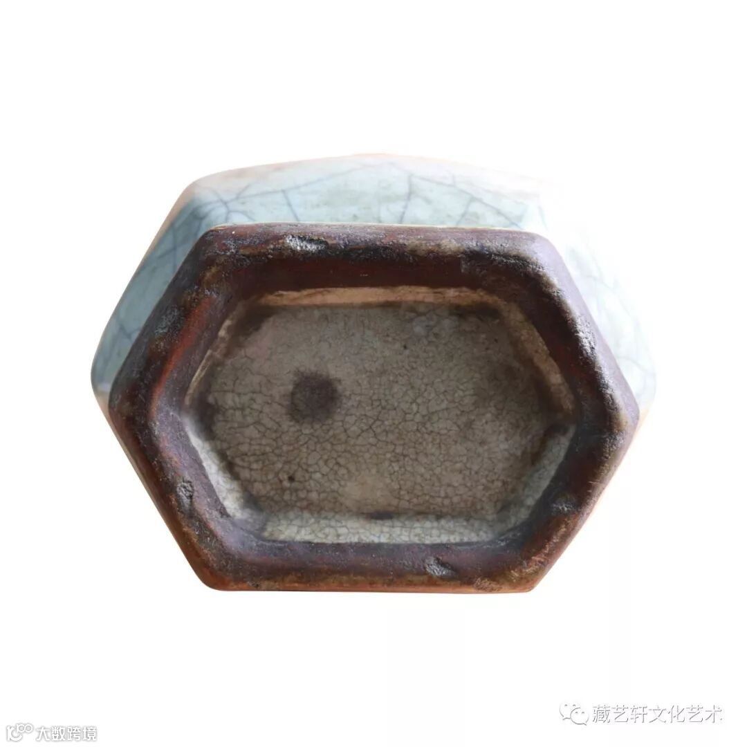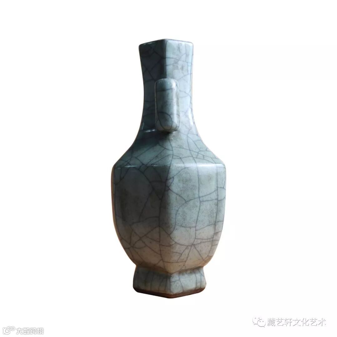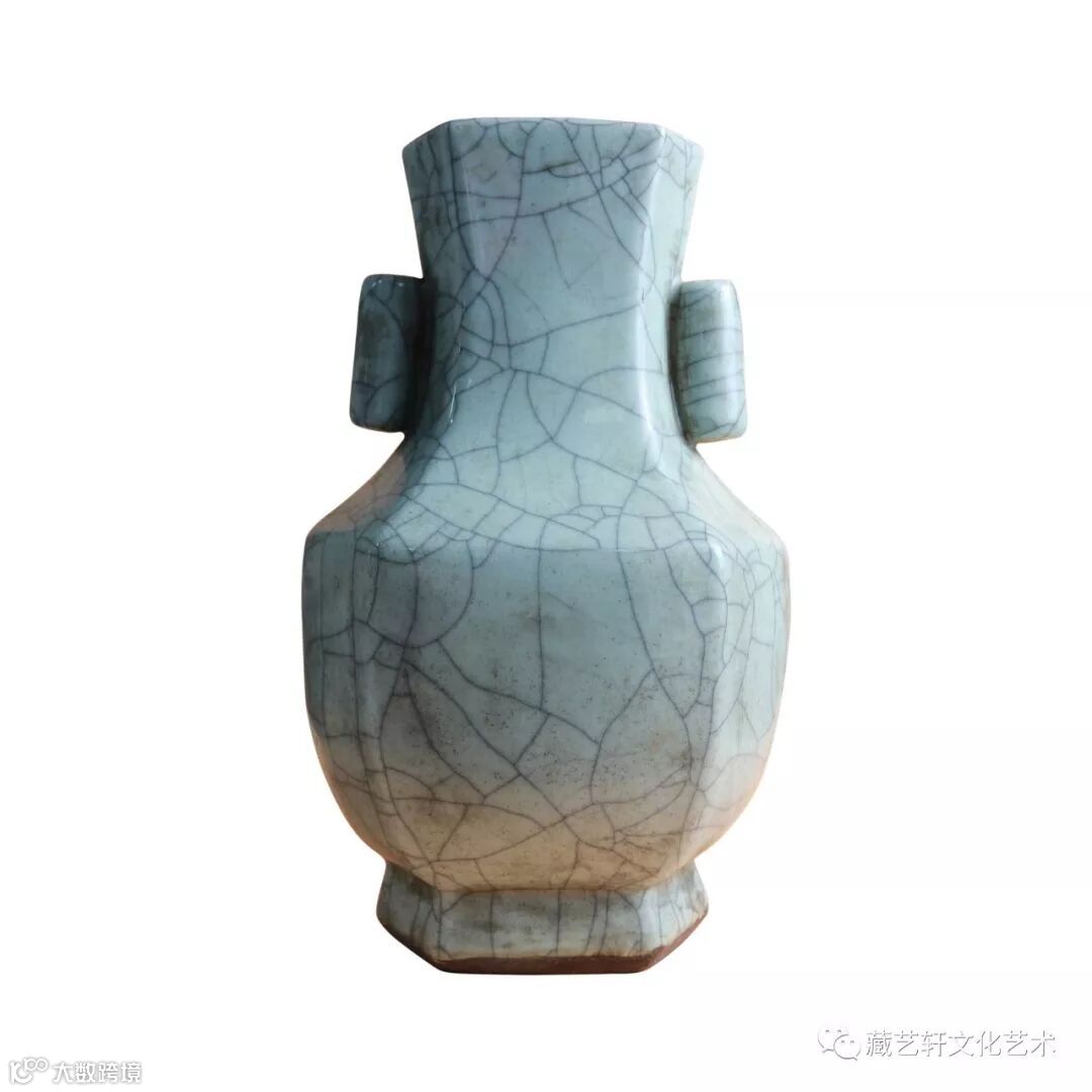 此件瓷器为清代官窑六方管耳瓶,造型工整,釉色饱满。瓷器呈六方形,长束颈,颈部饰对称的双管耳,折肩,敛腹,足外撇,造型庄重,胎体坚致, 造型敦实大气。器身六道棱角自上而下随形贯通全器,风格硬朗,线条起伏婉转,古意悠然。开片遍布全器,色泽苍雅静穆,清雅隽永,光泽厚润柔和,此瓶器身精致隽秀,釉色肥润失透,器身光素不事雕饰,富有天然韵致,尤显温婉尔雅,釉色淡恬之柔美配饰六方硬朗之造型,搭配得宜,自然淳厚却不失文人气质,釉面光洁莹润,极富玻璃质感。色泽淡雅娇嫩,极见匀净雅靓之致。灵秀典雅,腴润如脂,呈现出一色釉瓷器酥润含蓄之美,圈足露胎处为黑褐色,以摹铁足之效果。