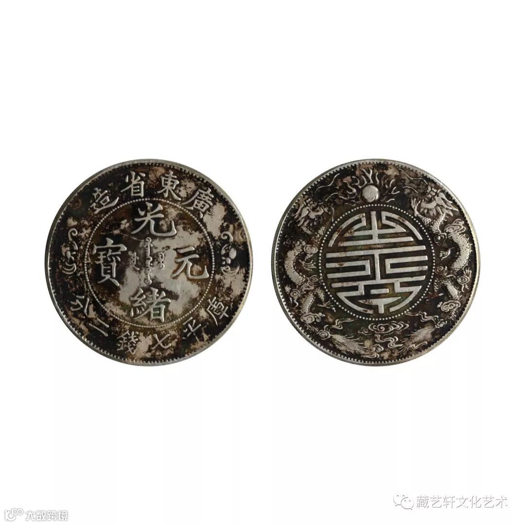 光绪元宝双龙寿字币:银币正面珠圈外上端镌刻“广东省造”四字,下端镌刻楷书“库平七钱二分”五字,左右两侧各镌有一蝙蝠图案,珠圈内铸有“光绪元宝”四字。银币背面珠圈外铸双龙戏珠图案,珠圈内铸一圆形“寿”字。银币设计极富特色,正面两侧所铸的一对蝙蝠图案寓意吉祥。因蝙蝠的“蝠”字与“福”字谐音,在币面上铸蝙蝠图案意在取“蝠”、“福”两字谐音,与背面的“寿”字相对应,寓意“福寿双全”。