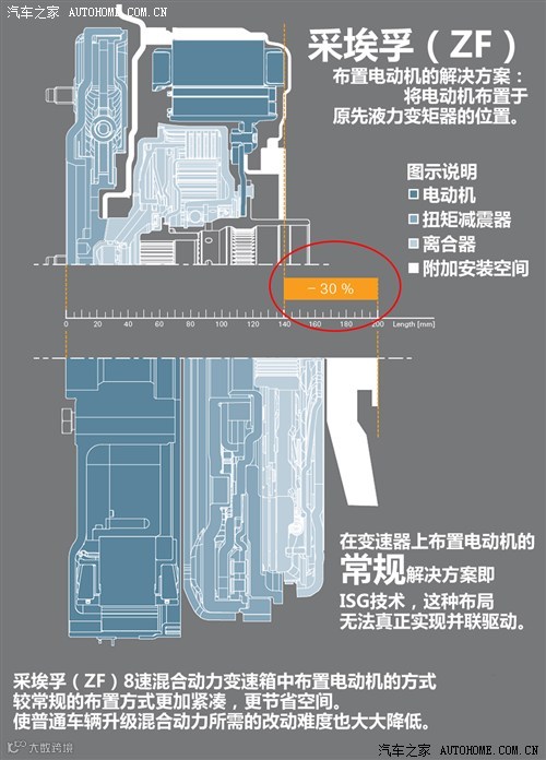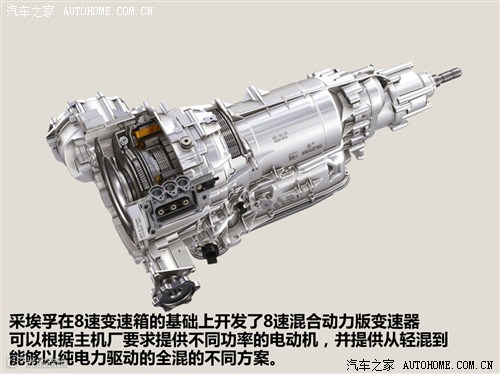 采埃孚用自己设计开发的混合动力系统搭载在自己的8AT变速箱上,推出了8速混合动力版变速箱。