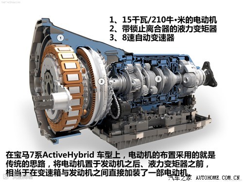 之前的宝马7系4.4T混合动力版--Active Hybrid7车型上使用的是我们上面提到的传统布置思路,在液力变矩器之前装上了一部同步电机。