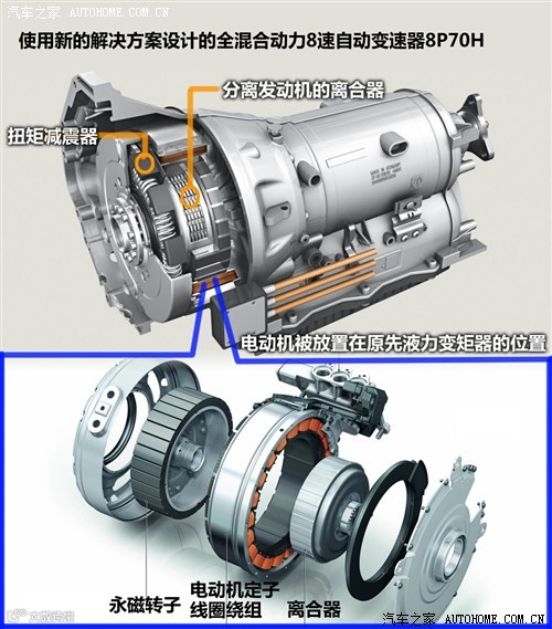 在之前的基础上,采埃孚又为8AT变速箱开发了一套并联式混合动力系统,取消了液力变矩器结构,换上了更大功率的电动机,将电动机、扭矩减震器、分离离合器集成的模块安装在之前液力变矩器的位置。由于分离离合器能够将电动机和发动机完全断开,因此可以实现发动机、电动机各自单独驱动车辆,同时也可合力驱动车辆的“并联”混合动力方式。