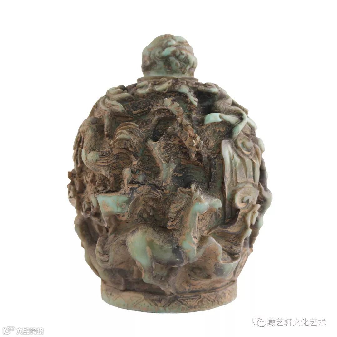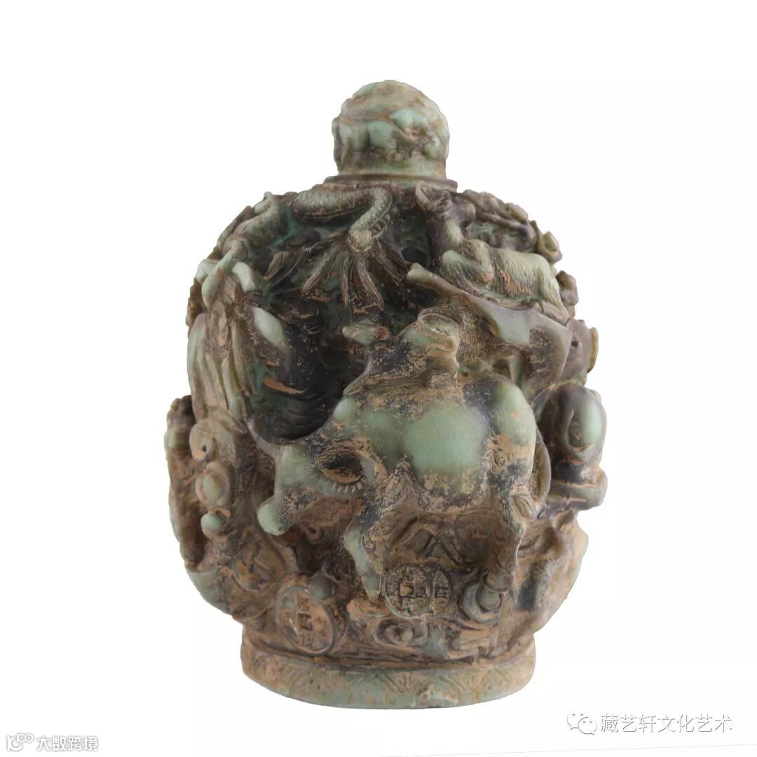 此藏品的球体表面镂刻各色浮雕精美繁复的纹饰,交错重叠,玲珑剔透;器身浮雕着十二生肖“子鼠骑丑牛;寅虎回头吼;卯兔思月皎;辰龙腾祥云;巳蛇出洞游;午马踏元宝;未羊跪乳咩; 申猴採寿桃;酉鸡啼报晓;戌狗迎贵客;亥猪憨又厚”。此藏品纹饰层次叠加,十分精美,质地暗绿,光泽内敛、凝重润厚;所雕刻的12个生肖栩栩如生,惟妙惟肖且还有镂空的雕刻工艺。
