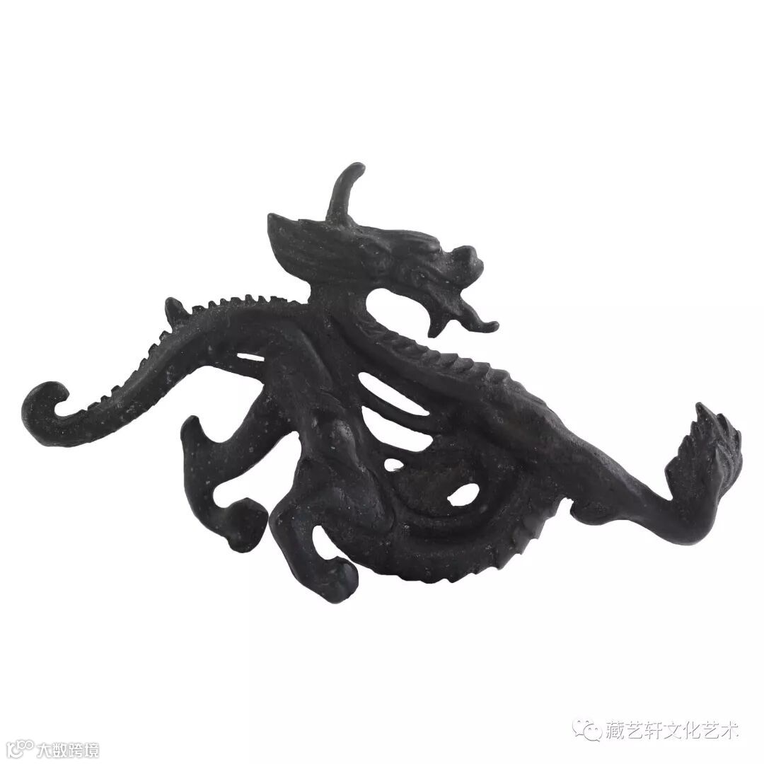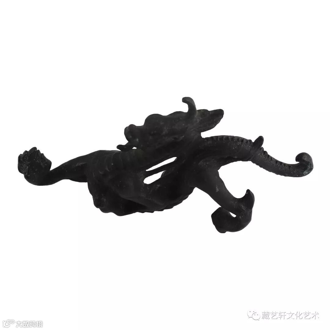 此件青铜摆件以龙为造型,头似驼,项似蛇、腹似蜃、鳞似鱼、掌似虎、耳似牛。龙体较细长,似虎形,身尾分明;龙口张开,颈下有逆鳞,龙背明确的脊鬣。古朴雍容,姿势矫健,大气威武,瞳孔深邃,犀利有神;龙鳞饱满,惟妙惟肖,雕刻细密有致,形态比例协调。整器造型雄伟,霸气十足。