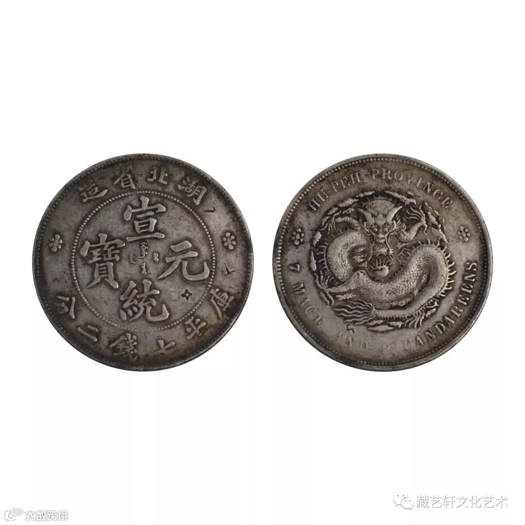 此枚湖北省造宣统元宝库平七钱二分银币,是宣统年间发行的宣统年号银圆,钱币正面铸有铭文,底部铸“库平七钱二分“, 银币背面外环用小号英文标准字体铭文,下为英文面值,左右分列六瓣花饰,内铸有蟠龙图,品相精致,其审美风格独持。其包浆入骨,熟旧自然,流通痕迹明显,边齿过关,龙鳞清晰,具有极高的投资价值和收藏价值。它有着历史熏陶,是价值很高的革命文物,具有深远的历史纪念意义。