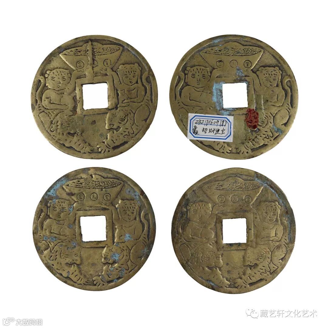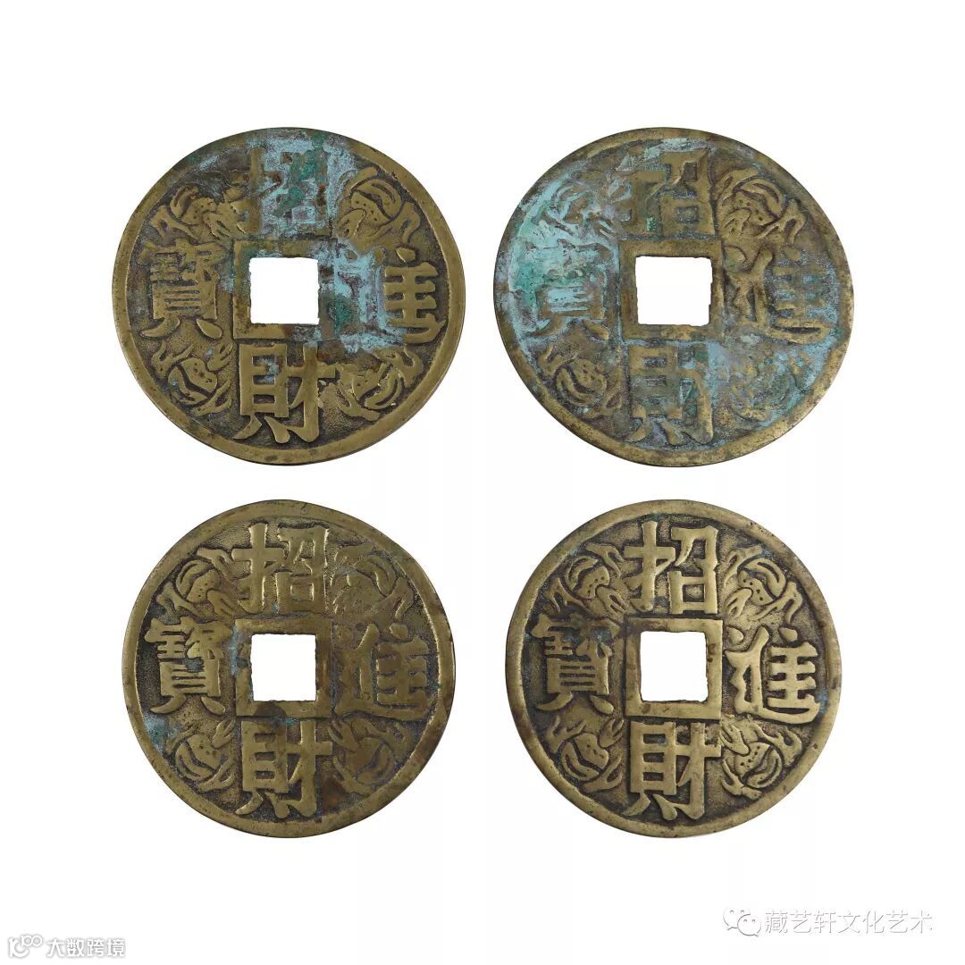 此组藏品为招财进宝花钱,正面印有“招财进宝”四字,从上而下而右而左直读,中间皆有方孔,为方孔圆钱;背面为童子送宝图。古时多用于社会交往,传递感情,表达寄托吉祥,除凶避邪的良好愿望和对幸福生活的美好追求,反映了古代民间风尚和习俗。藏品具有巨大的收藏价值和投资价值。
