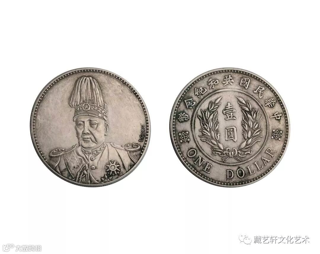 中华民国共和国纪念币英文签字版,也称袁世凯高帽像币(签字版)。中华民国元年(1912年)意大利雕刻师乔治受聘于天津造币总厂,铸造模具,由天津造币厂铸造了袁世凯着军装高樱冠正面像中华民国共和纪念币银币,民国二年(1913)十月十日,袁世凯正式就任大总统,同时发行此币。此币图案极其精美,是民国机制银币中的精品。正面为袁世凯九分脸正面及胸像,面部稍左侧,袁世凯身着大元帅服,头戴鹭羽冠,胸前佩戴大勋章,银币背面中央镌“壹圆”二字,以嘉禾围绕,上镌“中华民国共和国纪念币”九字,左右各一珠花纹,下面镌英文一元“ONE DOLLAR”。
