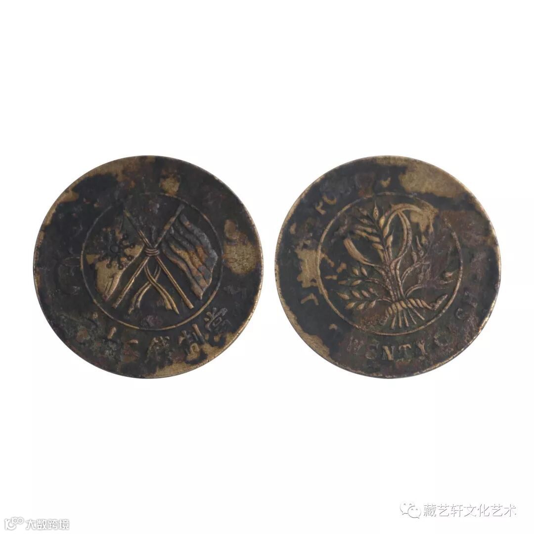 这枚珍稀的双旗币当制钱二十文错版币,钱币正面中间为两面交叉的国旗,上环铸省份,下环铸“当制钱二十文”字样,钱币背面中心是由稻穗组成的嘉禾纹,外环一圈英文字样。而这枚错版币错背面图文整体向左偏离约30度,故而显得特别。