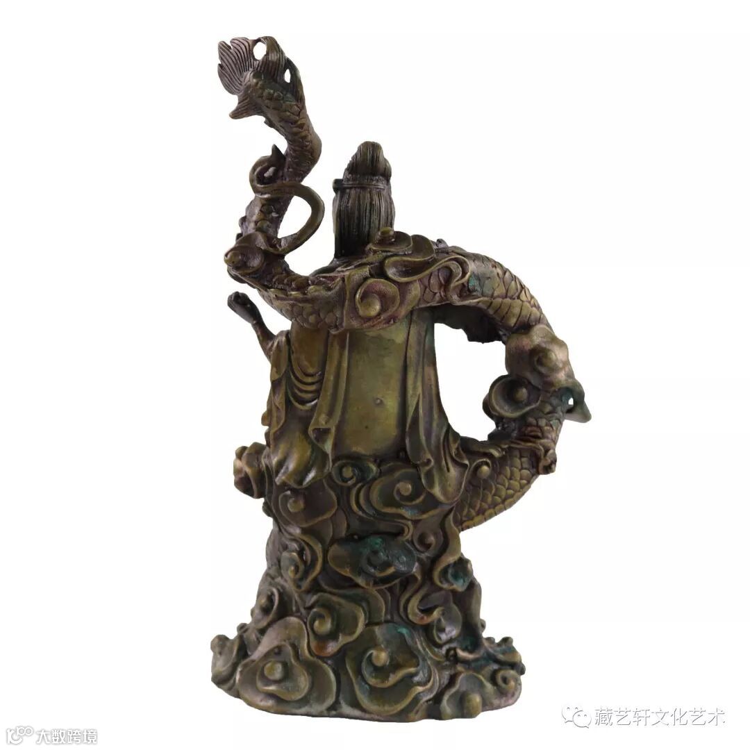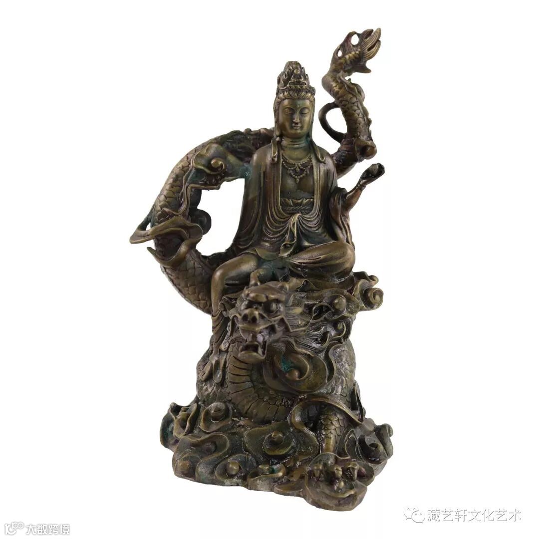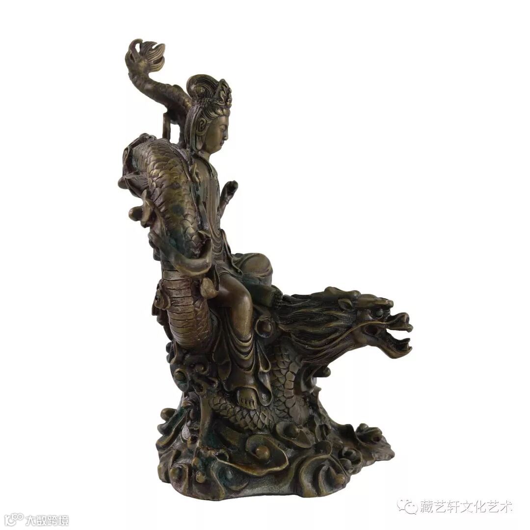 此藏品铸工细腻,龙鳞细纹清晰,观音人像、发丝、神态等细微之处清晰有度,生动自然,铸造精良,艺术造型精美绝伦。龙能从海中取水到天上,观音站立于龙头之上,是为了使天下风调雨顺,普降甘霖在人间,保佑天下太平。具有很高的文物收藏价值以及艺术品鉴价值。