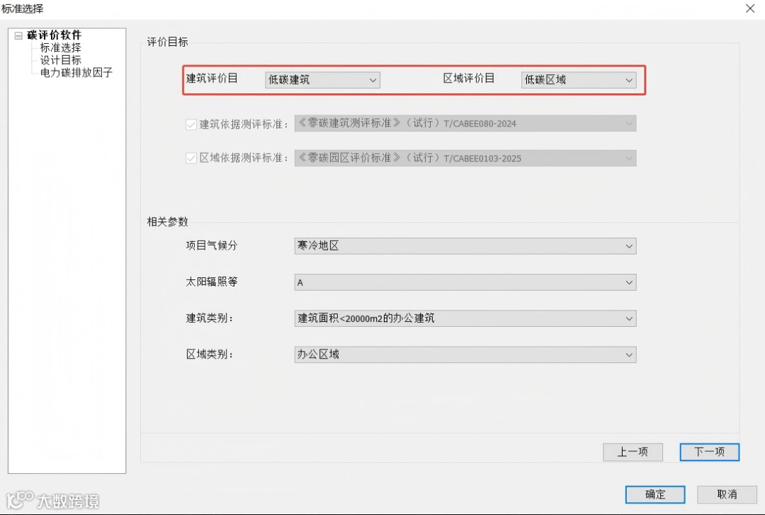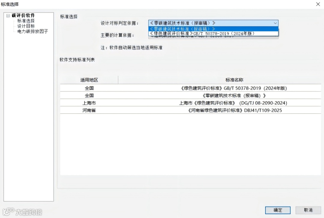 一套模型,两种评价体系,菜单下拉直切“绿建评价标准”与“零碳技术标准”。