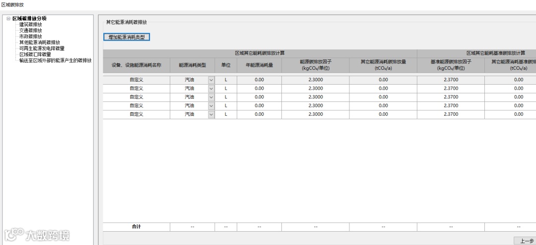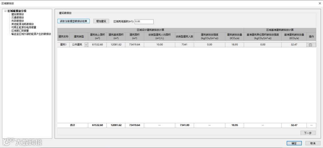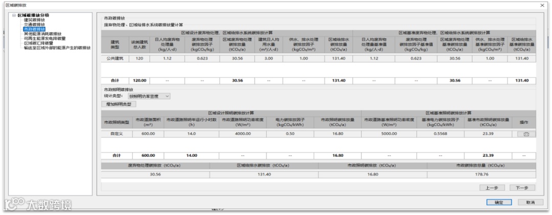 区域碳排放计算中支持读取设置建筑碳排放、交通碳排放、市政碳排放、其他能源消耗碳排放及绿化碳汇等。