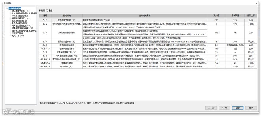 左侧树状节点全景展示所有建筑/园区技术控制措施;右侧自动读取模型热工指标与能效等级,实时比对标准限值;红绿灯直观显示达标状态,精准定位缺口,无需盲猜。