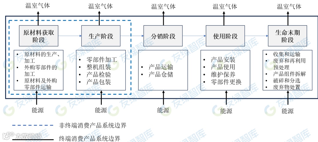 为直观呈现边界范围,《征求意见稿》还配套了系统边界示意图。这种差异化边界设定,既避免了非终端产品因“使用阶段依赖系统”导致的核算偏差,又确保了终端产品碳足迹的完整性,符合零碳园区对设备全生命周期碳数据的需求。