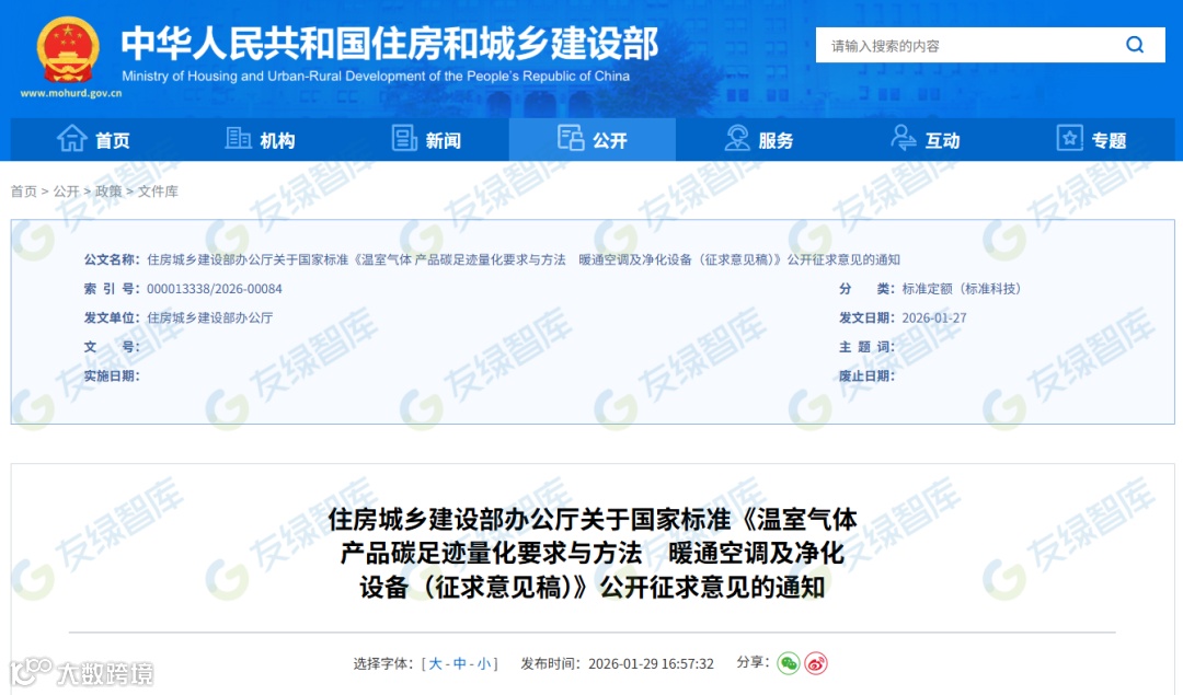 1月29日,住房城乡建设部办公厅发布了《温室气体产品碳足迹量化要求与方法暖通空调及净化设备(征求意见稿)》(以下简称《征求意见稿》),这份标准不仅填补了国内暖通空调及净化设备碳足迹核算的标准空白,更为零碳园区建设提供了关键技术指引。