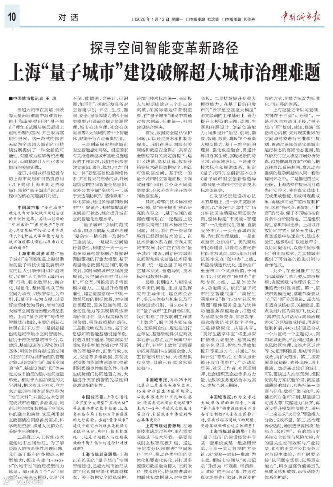 近日,中国城市报记者专访上海市规划和自然资源局(以下简称上海市规划资源局),围绕“量子城市”建设过程中的核心问题展开对话。